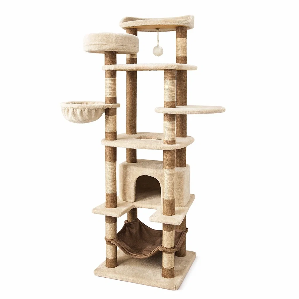 Arbre à chat en bois et en sisal avec revêtement en peluche. Comprend plusieurs plateformes, un hamac et une balle suspendue pour le jeu. Dimensions : hauteur totale de 175 cm, largeur de 60 cm, profondeur de 45 cm. Les plateformes mesurent 30 cm de diamètre. Poids total de 20.5 kg. Équipé de cinq étages pour offrir divers endroits de repos et d'amusement pour les chats. Nettoyage avec chiffon humide recommandé.